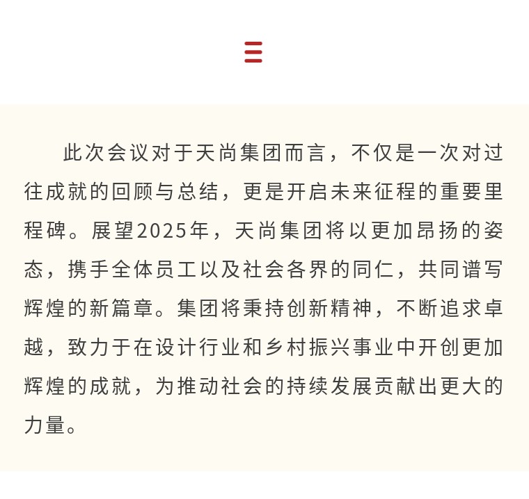 天尚集团副总裁张圣杰介绍了2025年工程事业部的经营模式、项目管理和风险管控。他表示,新的经营模式将深度融合数字化工具与智能化平台,实现项目管理流程的无缝对接与透明化,进一步提升决策效率与质量。同时,集团将推行一套全方位、精细化的管理体系,确保每一个项目从规划到交付的每一步都精准把控,质量卓越。展望新年,天尚集团将以更加振奋的精神面貌,携手全体员工及社会各界同仁,共同谱写辉煌的新篇章。