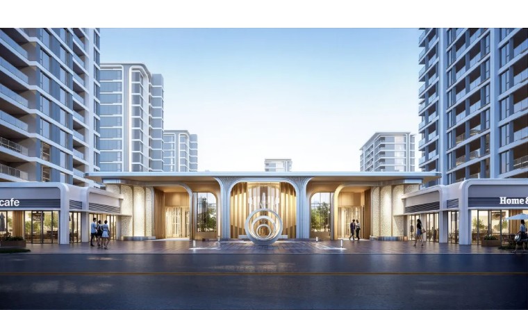 从社区主入口(酒店式无雨落客区)、社区会所、中央花园,到架空层泛会所、地上地下双大堂、精装电梯厅,层层递进提升归家仪式感。