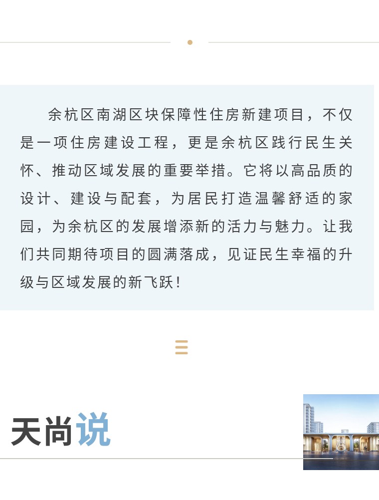 住房保障,是民生幸福的基石。今年以来,余杭区住建局积极响应民生需求,全力推进公租房建设项目,切实为群众解决住房难题。近期,备受关注的余杭区南湖区块保障性住房新建项目正式启动,该项目由天尚集团负责设计,选址杭州城西科创大走廊——这里以“科技创新”为发展核心,聚焦基础科学与原研创新,致力于完善“研-学-产-用”功能体系,打造科学中心标杆区、产业转型实践区与千年湖城样板区。