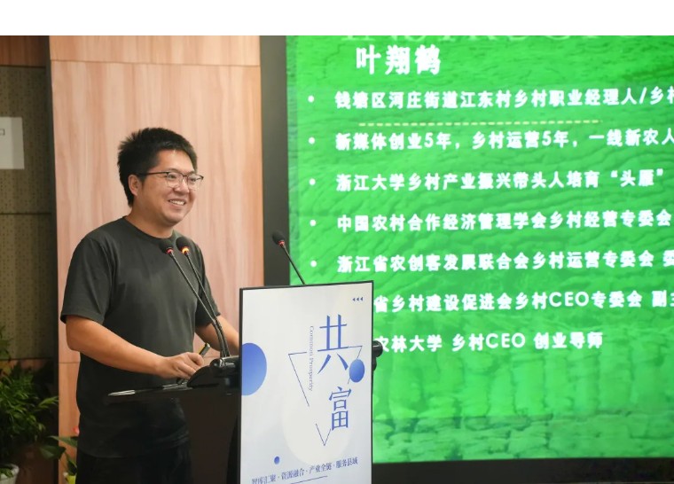 杭州市钱塘区河庄街道乡村CEO、“头雁”学员、杭州闲梦文旅有限公司总经理叶翔鹤分享了公司在江东村的青年入乡实践:针对村庄人口老龄、空心化等问题,搭建青年入乡一站式服务平台,通过“校-地-政-企”协同,打造乡创空间与农文旅项目,开展直播助农、乡村造节,培育乡村CEO与新农人,带动村集体增收,形成可复制模式,还推动多村联动及省内外合作,助力乡村振兴。