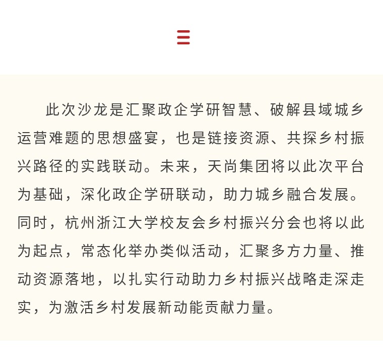 本次沙龙由杭州浙江大学校友会乡村振兴分会主办、副会长单位天尚集团承办,杭州浙江大学校友会乡村振兴分会秘书长、浙大新农院教培中心主任何水平主持。活动旨在搭建跨界交流平台,汇聚政企学研多方智慧,破解县域城乡运营痛点,探索可持续发展路径,为乡村振兴注入新活力。