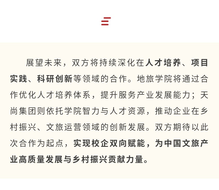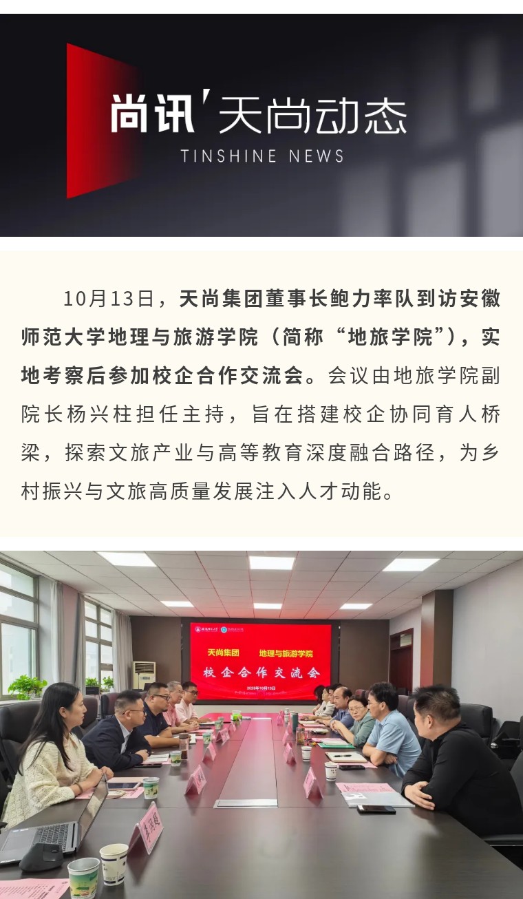 经过深入交流,双方达成初步合作共识:一是推进战略合作签约,明确后续合作框架;二是定制化人才培养,计划成立“天尚班”,结合企业需求调整课程设置,共同制定教学计划,培养输送人才;三是共建实践基地,选址天尚集团运营的南陵县家发镇板石岭项目——该项目以“桂”为核心,打造多元体验的桂乡村生活目的地与农文旅三产融合示范地,可满足学生项目实操需求。