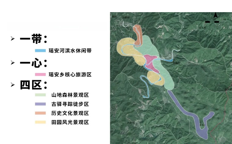 瑶安乡的蝶变,始于一张精准绘就的规划蓝图。项目结合瑶族非遗文化、红色基因与生态优势,打破传统景区“单点布局”模式,以“乡・河・驿・田・山・文”为核心要素,规划“一带一心四区”的空间结构,形成 “全域覆盖、功能互补” 的旅游格局。
