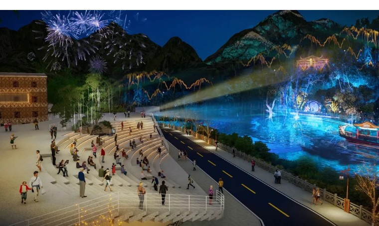 以瑶安河为轴线,打造“24小时不落幕”的滨水体验带:白天可乘特色竹筏漂流、在滚水坝戏水区亲水,夜晚则有“一河两岸夜景”灯光秀、云水瑶水上全息灯光秀,沿河布局瑶家美食夜市、山歌对唱台,让“水韵”成为瑶安的灵动名片。