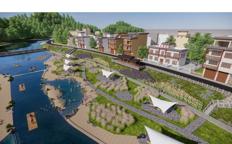 瑶安河滨水带采用“自然驳岸”设计,种植根系发达的植物固土,设置竹筏码头、河滩露营地、树下休闲吧,游客可赤脚在卵石滩戏水,或在河边烧烤、听山歌;田园风光区保留稻田肌理,用油菜花打造网红打卡点;古驿寻踪徒步区保留古驿道的石板路、古树,增设“古驿隐亭”供游客休憩,远眺群山,近听鸟鸣,感受 “古驿悠然”。