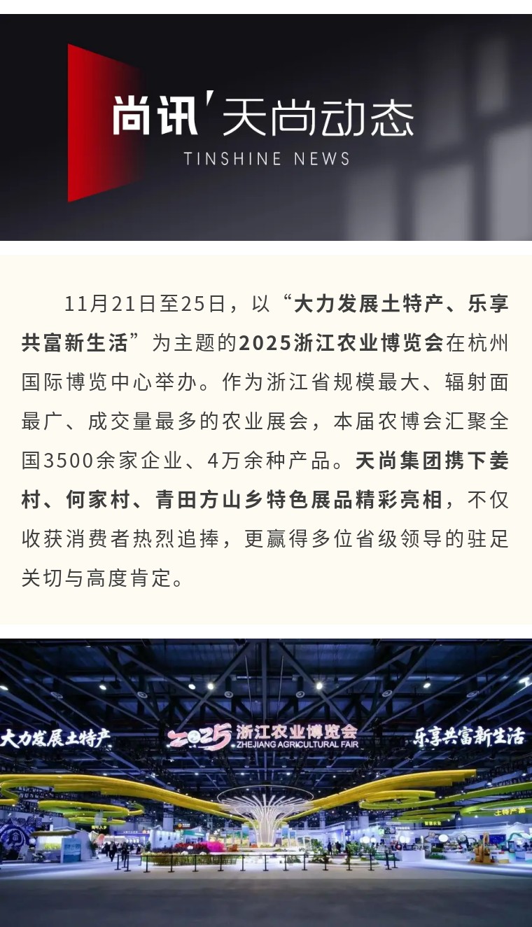 展会期间,浙江省委书记王浩,浙江省委副书记、省长刘捷先后赴农博会考察,在了解浙江省“十四五”农业农村发展新成就、察看农产品展示展销情况的同时,特意走进下姜村・天尚集团展位。两位省领导与天尚集团下姜村共富后巷项目运营经理、乡村CEO、下姜村青年入乡代表、农业高级经理人张译文深入交流,详细询问下姜村、何家村及青田县方山乡农特产品的生产工艺、市场销售及产业链发展情况,对当地特色农业发展成果给予关注。
