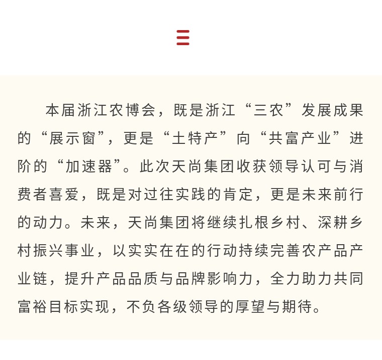 丰富的展品矩阵,既是特色农业发展成果的集中呈现,更是天尚集团深耕乡村产业、赋能共同富裕的生动实践——从产品研发到品牌打造,从产业链整合到附加值提升,每一件展品都承载着天尚集团助力乡村振兴的扎实行动。