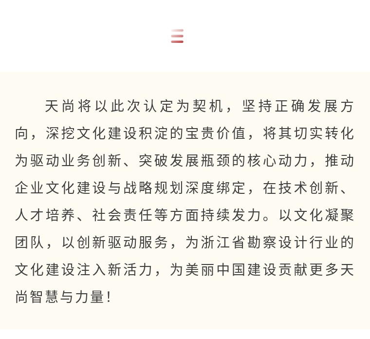 天尚设计集团的发展历程,始终以文化为内核突破前行:从早期聚焦建筑、园林领域的单专业设计,到整合建筑、景观、装饰、市政等多领域资源,构建覆盖“设计-落地”全流程的综合性服务体系,再到创新打造以顶层设计为引擎、产业价值为导向,联动勘察、咨询、监理、造价等专业服务的“1+1+N”全过程咨询模式,每一次打破行业边界的跨越式发展,都离不开企业文化的深度赋能。“天成自然,尚美中国”的核心口号指引服务方向,“共创、共建、共享”的价值观凝聚团队力量,“追求卓越、协同共赢”的理念驱动模式突破,文化如贯穿始终的脉络,为企业提供源源不断的精神滋养与行动指引。