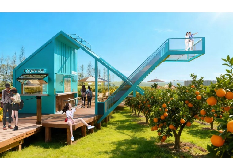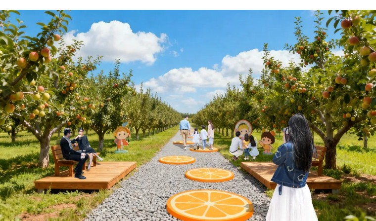 此外,区域内还设有果咖漫语咖啡观景台、果园餐厅、主题雕塑等配套设施,串联成一条集观光、休闲、研学、消费于一体的农文旅环线,满足不同客群的多元化需求,让田园生活成为触手可及的休闲体验。