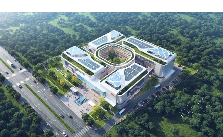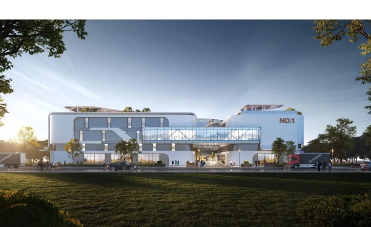 建筑立面遵循“高效、集成、透明”理念,以浅灰与白色为基调,局部点缀深灰色与橙色,通过浅灰色金属压型钢板、白色质感涂料与超白玻璃的组合,实现美学、功能与成本的统一。屋顶打造集绿色能源生产、生态调节与人文活动于一体的“第五立面”,铺设太阳能光伏板并规划休闲观景平台,实现可持续发展与员工福祉的双重提升。
