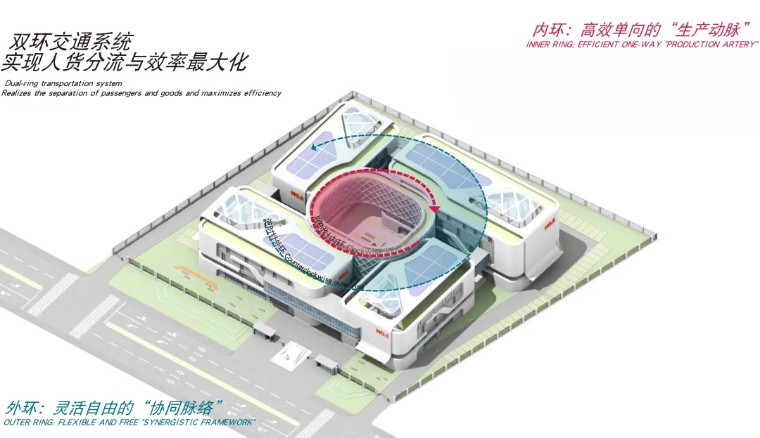 产业园总用地面积约20.14亩,总建筑面积16000 平方米,采用“风车状布局”与“内外双环 交通系统,内部顺时针主环线确保原材料、半成品与成品在四大功能区之间流转路径最短,外部辅助逆时针环线实现人货分流、洁污分区,保障生产高效有序。