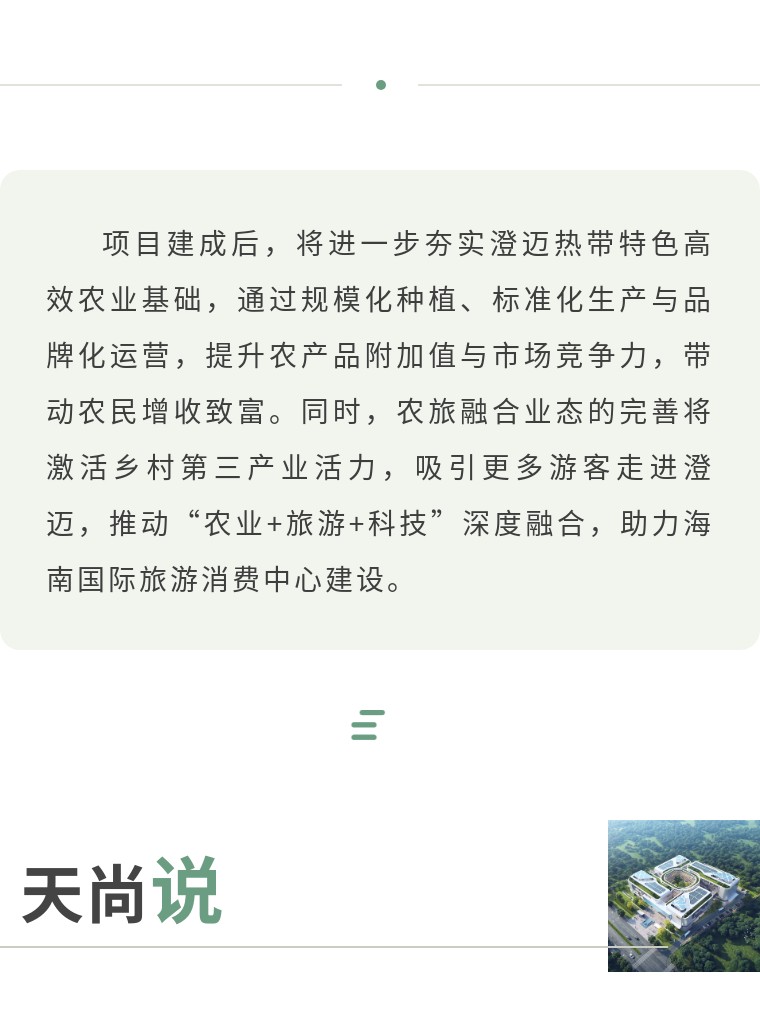 项目选址于澄迈县桥头镇、大丰镇片区,规划周期为2025年9月至2027年8月,是一场以“智趣红山・澄迈果核”为核心的农业农村现代化实践。依托富硒土壤、农耕文化等核心基底,融合智慧科技与四季果园资源,项目构建“智享红山・热带农业综合体”品牌,打造集都市休闲农业、科创农业、文旅产业等功能于一体的农智旅融合型田园综合体,旨在成为海南省乡村振兴示范地、农业双强样板区与田园休闲游憩新名片。