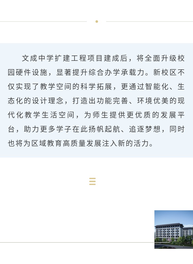浙江省文成中学创办于1941年,作为首批浙江省普通高中二级示范特色学校,历经八十余载办学实践,已形成深厚的文化积淀。学校坐落在优美环境中,教学设施完善。为适应新时代教育发展需求,文成县重点推进文成中学扩建工程,由天尚集团提供全过程咨询服务,涵盖规划、设计、建设管理等各环节。这一项目既是改善校园硬件的必要举措,更是提升办学质量的关键抓手,通过专业团队的全程把控,将为师生打造更优越的教学环境,推动学校办学水平迈上新台阶,持续为社会输送优秀人才。