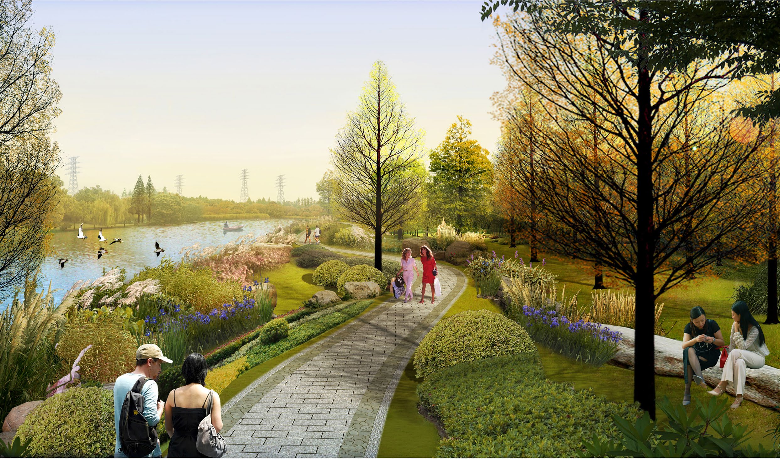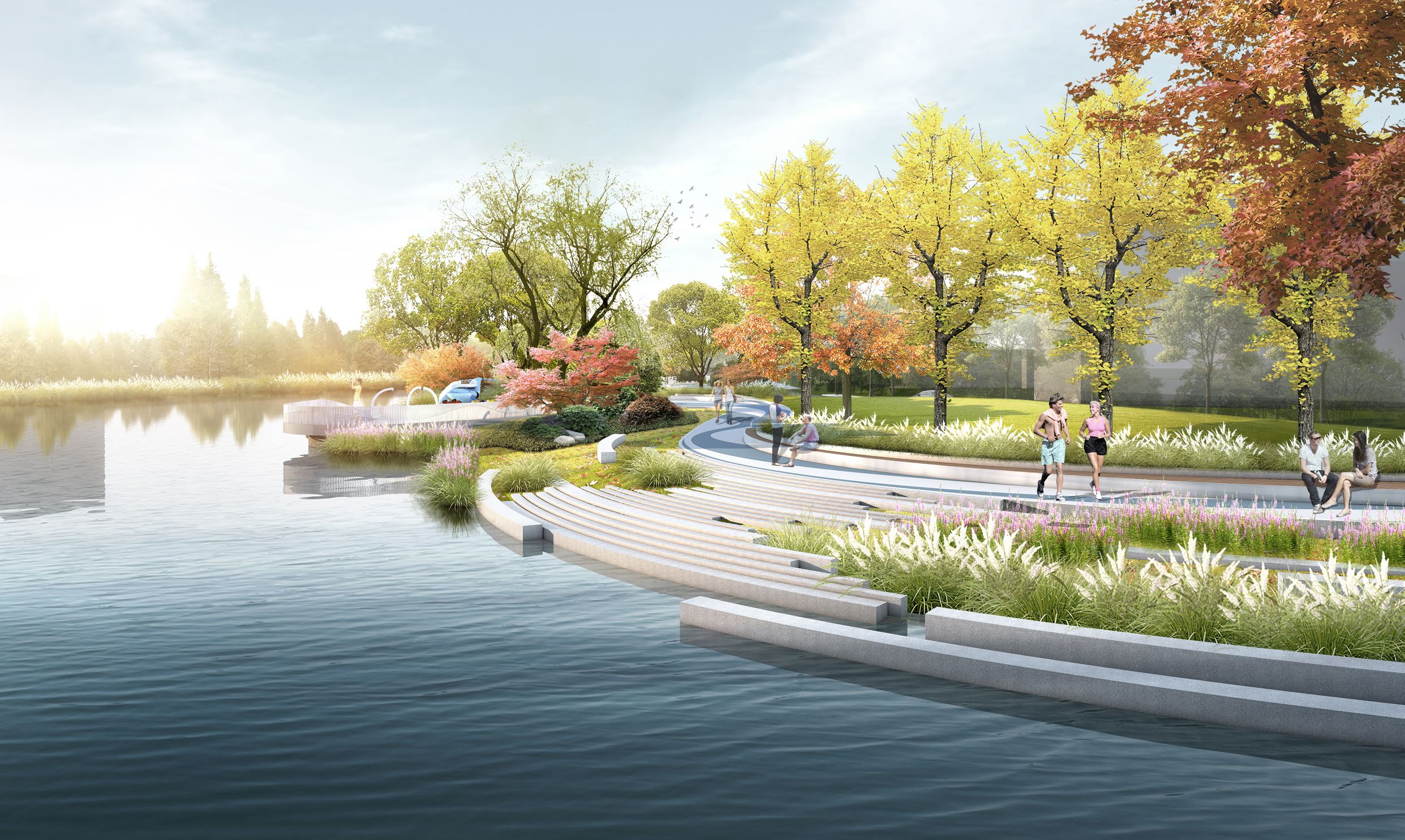 东伏河沿线景观提升改造方案及施工图设计项目位于盐城市盐南高新区,周边旅游资源丰富,文化资源丰厚且风景秀丽,交通便捷,优势显著,设计面积约为245000平方米。通过植栽实现植物的多重绿化,达到前景、中景、背景的多层次绿化景观效果;通过提高彩叶植物的应用比例、植物的季相变化来突出植物鲜活的生命力;采用密林与艺术化的流线形花卉,营造具有视觉冲击力构图方式;借助立体绿化、建筑以及小品多维度引入绿色DNA,唤醒城市生态,激发生命活力。