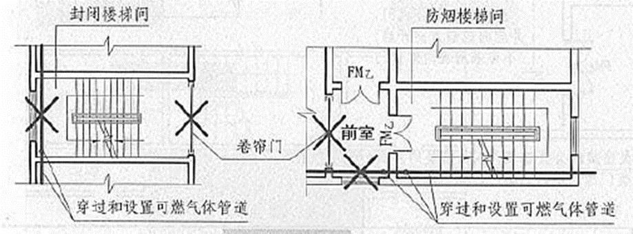 ⑥ 封闭楼梯间、防烟楼梯间及其前室内禁止穿过或设置可燃气体管道。
