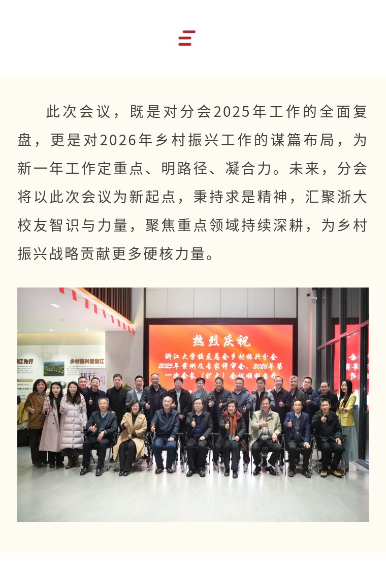 会议最后,浙江大学发展委员会副主席、浙江省科协副主席、分会会长应义斌在总结讲话中用“连接赋能、初见成效”概括了2025年分会工作,并对新的一年提出“聚焦重点、持续深耕”的工作要求。2026年是实施“十五五”规划的开局之年,也是浙江大学迎接130周年校庆的筹备之年。乡村振兴分会要以此次会议为契机,紧密围绕国家战略和学校发展部署,凝聚更广泛的校友力量,聚焦重点领域,持续打造品牌活动,为浙江“千万工程”经验的推广、为国家乡村振兴战略的实施贡献浙大智慧和力量。