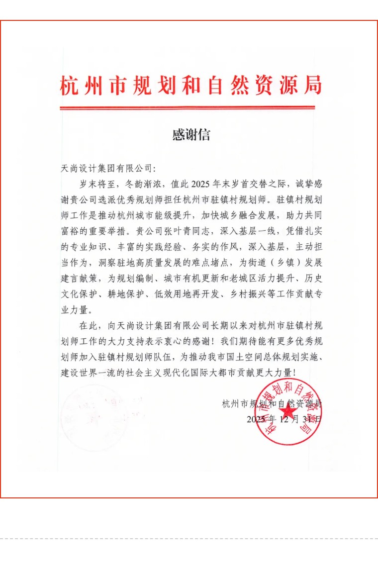 1月初,天尚设计集团收到杭州市规划和自然资源局发来的感谢信,对集团选派规划师张叶青担任驻镇村规划师期间的专业付出与贡献表示诚挚感谢。