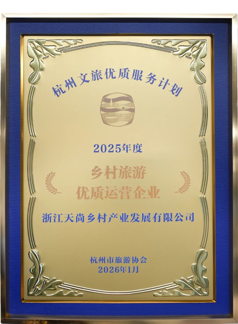 1月29日,2025年度“文旅优质服务计划”表彰盛典在杭州城北文澜大酒店隆重举行,浙江天尚乡村产业发展有限公司荣获2025年度“乡村旅游优质运营企业”。