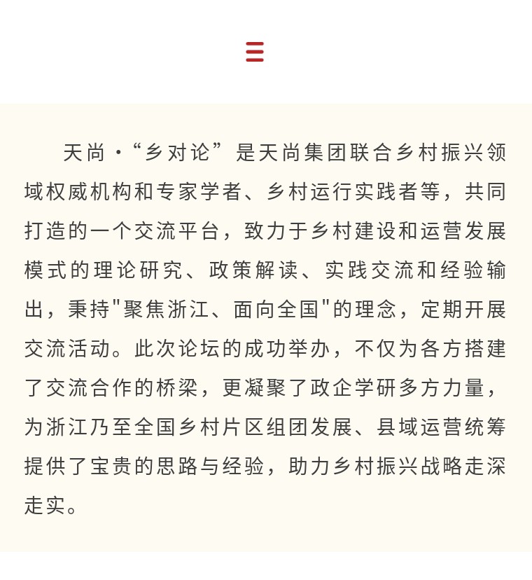 本次论坛由浙江省乡村建设促进会、杭州浙江大学校友会乡村振兴分会主办,浙江省乡村建设促进会业态发展专业委员会、天尚集团承办。汇聚政府、高校、企业各界乡村振兴领域优秀大咖,包括原浙江省农办副主任、浙江省委高质量建设共同富裕示范区专家委员顾益康,浙江省社会主义学院原一级巡视员张建明,浙江省乡村建设促进会会长、浙江省人大常委会咨询专家蒋文龙,杭州浙江大学校友会乡村振兴分会会长、杭州农副产品物流网络科技有限公司董事长祝毅,杭州市残疾人福利基金会理事长、杭州市西湖区小小生命健康基金会创始人钟晓晓,浙江大学旅游与休闲研究院副院长严力蛟等业内专家、行业大咖与乡村实践者,近50人探讨乡村振兴新模式。