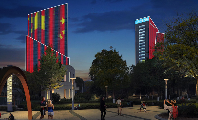 针对包括绿谷大道、成大街各个方向主要视角的整体夜景效果,进行多角度的实景照片灯光效果模拟,确保设计效果的完整性、统一性。根据不同时段、不同主题节日需求,控制形成不同模式,设置成平时、节日、重大节日和深夜四种亮灯控制,给予人们多样的灯光感受和氛围。